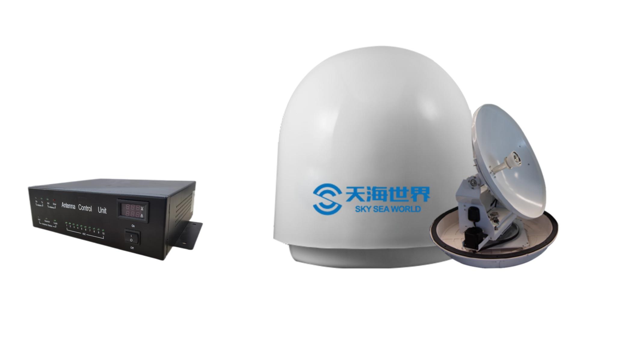 整合了衛星天線、衛星調制解調器、ACU天線控制單元、POE交換機、網關、和船載服務器。