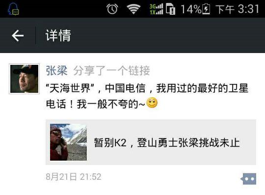 張梁一向將安全放在第一位,和去年離頂峰僅有300多米的地方理智選擇后撤一樣;這一次,同樣為了安全和通信順暢的考慮,他帶上了天海世界提供的舒拉亞XT-LITE衛星電話,前兩天還在六千多海拔的高峰上與我們進行通話,愿我們的舒拉亞電話變成張梁的安全守護神,讓我們一起祝福他再次完成挑戰,凱旋歸來。張梁,加油!