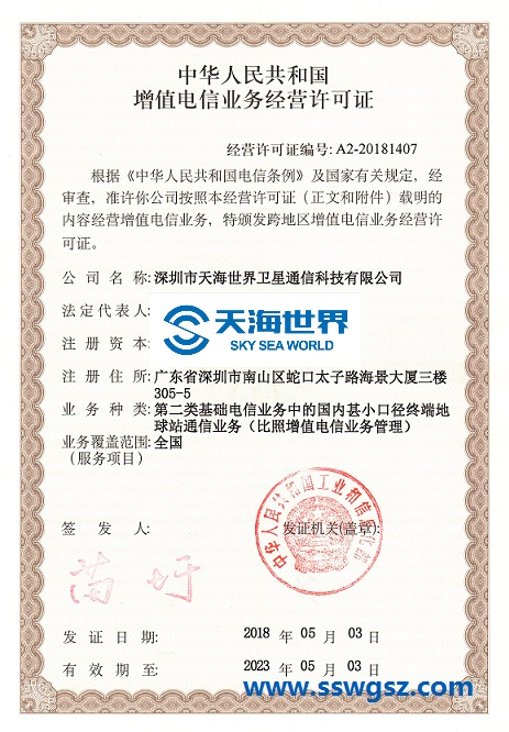 天海世界喜獲由中華人民共和國工業(yè)和信息化部頒發(fā)的《中華人民共和國增值電信業(yè)務經營許可證》,業(yè)務種類為基礎電信業(yè)務中的國內甚小口徑終端地球站通信業(yè)務。這一證書的頒發(fā),保證了公司衛(wèi)星通信業(yè)務合法經營的權利,為公司業(yè)務的開展提供了有力的條件。