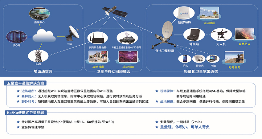 地面通信網、衛星與移動網絡融合、輕量化衛星寬帶通信。